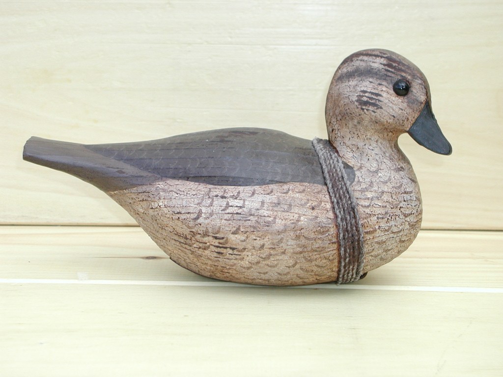 Our stylish Premiere Green Wing Teal Hen has carved wings and painted with mellow hues of brown. It would be a great companion to our Premiere Green Wing Teal drake. It features a turned head, carved wings, glass eyes, lead weight, an anchor line, and a distressed patina. It is branded with the “WHITE” name and measures apprx. 10″ long x 5″ wide x 6″ high.