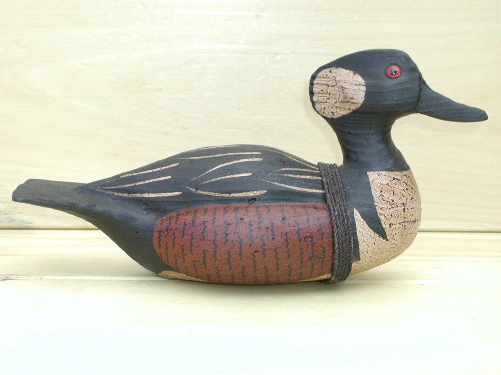 Our Premiere Hooded Merganser is carved as a contented fellow, all snuggled in. He would look great nestled on a fireplace surrounded with some greens. Features include carved and painted feathers, red glass eyes, lead weight, and a distressed patina. It is branded with the “WHITE” name and measures apprx.12″ long x 5″ wide x 6″ wide.