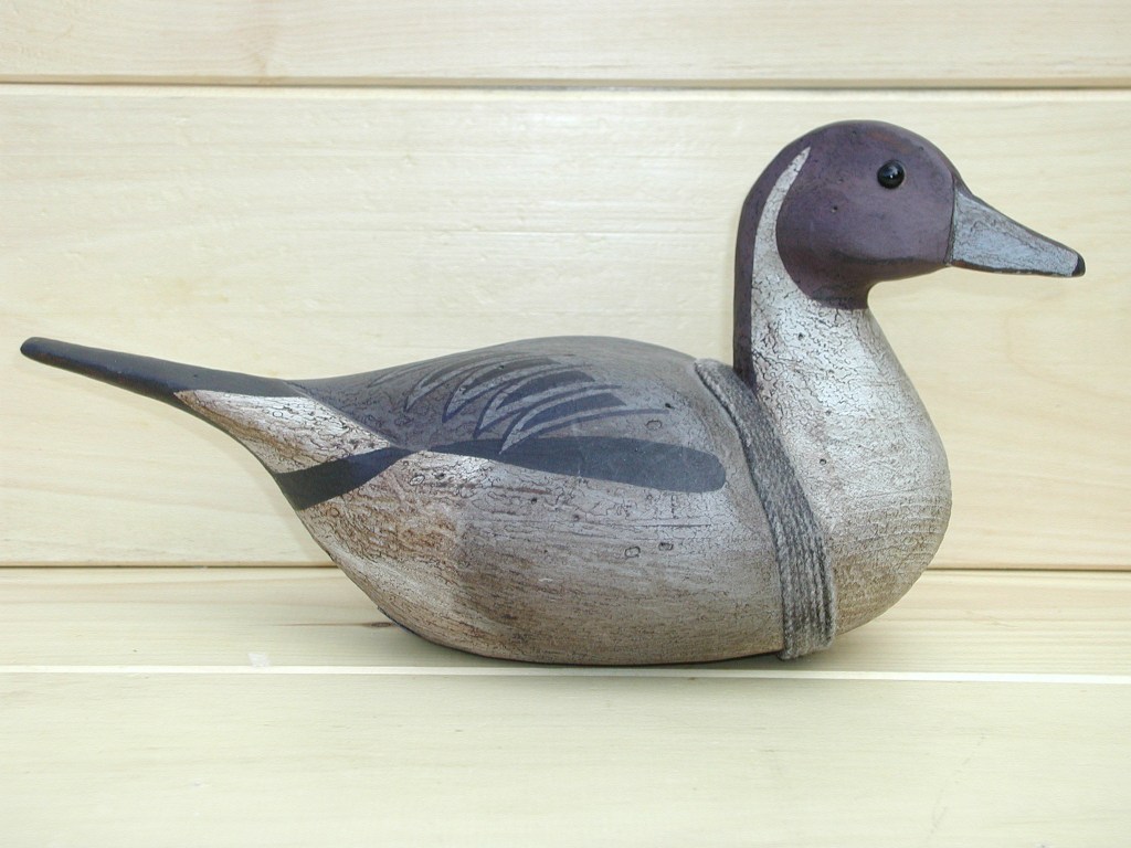 Our Premiere Pintail is carved to reflect the subtle beauty and grandness of this bird. Its head is turned, giving it a noble stance. Features include black glass eyes, carved wings, lead weight, an anchor line, and a distressed patina. It is branded with the “WHITE” name and measures apprx. 14” long x 5 1/2” wide x 7” high.