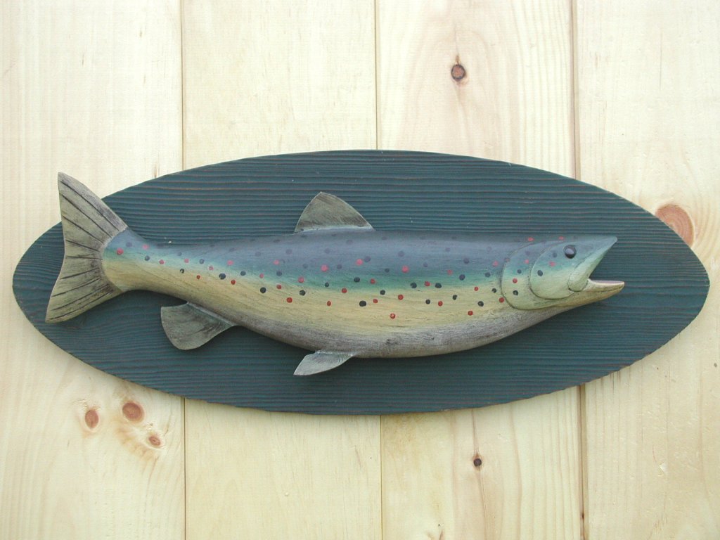 Remember the big one that got away? Our Brown Trout plaque would fulfill any angler’s dream. This would look great in a lodge or den, even over the fireplace. Features include black glass eye, carved gills and mouth with inletted wood fins. The fish is mounted on an oval green plaque that hangs on the wall. It measures apprx. 24″ long x 9″ high x 2 1/2″ deep.