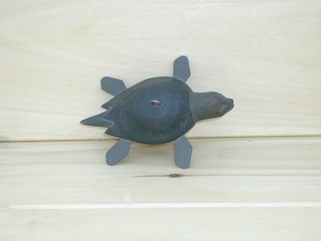 This lovable, little Turtle is carved from white pine, has inletted metal legs, and brass tack eyes. He measures apprx. 5 ½” long x 1 ¾” high x 3 ½” wide (with fins).