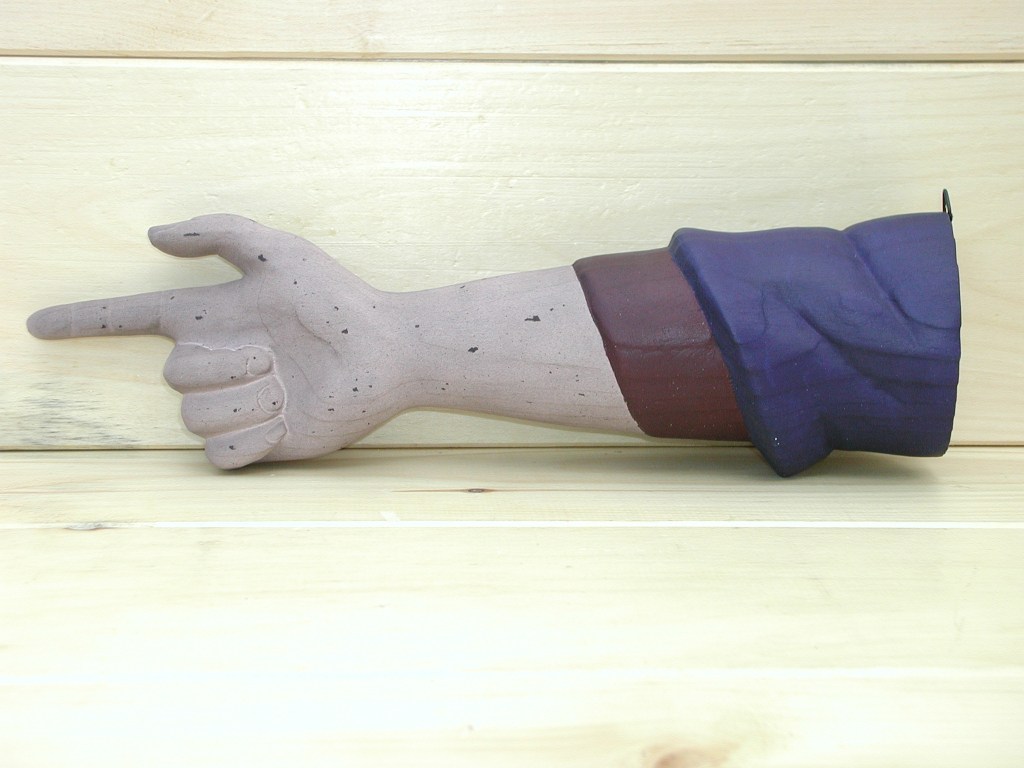 Folk Art Trade Signs were a way of drawing attention to something of interest. Our pointing “Finger” is a whimsical folk art trade sign reminiscent of a bygone era where signs pointed the way. Our Finger can be hung from a shelf or beam by two hooks or can be wall mounted (specify). This makes a fantastic conversation piece. Features include carved hand & finger details, antiqued “polychrome” paint, and an antiqued toned finish. It measures apprx. 17” long x 4” wide x 4” high.
