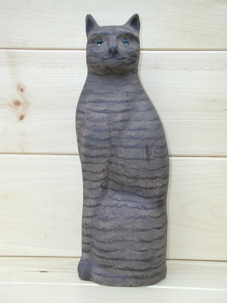 Welcome this low maintenance cat into your home. He doesn’t need fed and is very quiet. Our Yellow Cat is a nice piece of American Folk art that could be used as a doorstop, or would look equally well on a fireplace or table setting. It has slit-pupil glass eyes and measures apprx. 16″ high x 5 1/2″ wide x 4″ deep.
