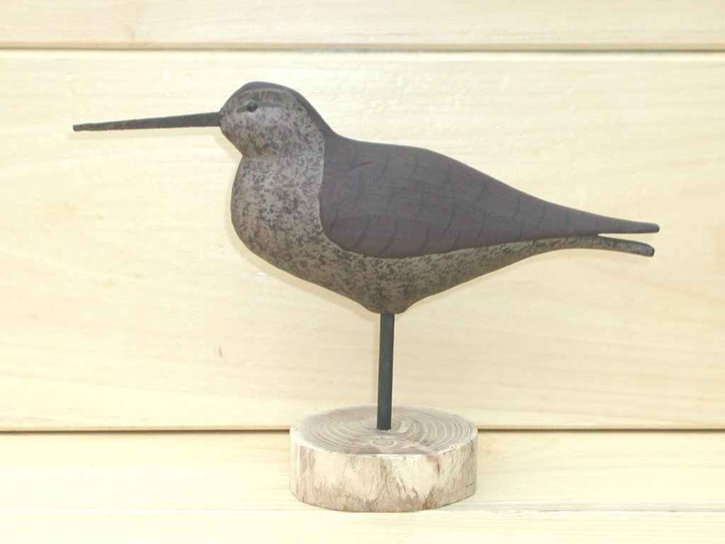 Often referred to as a “Robin Snipe”, our Dowitcher is painted in its brick-red spring plumage. This classic carving features a split tail, glass eyes, a cut nail beak and measures apprx. 10″ long x 2 1/2″ wide x 7″ tall on its base.
