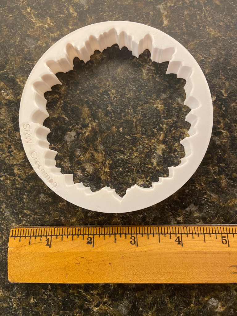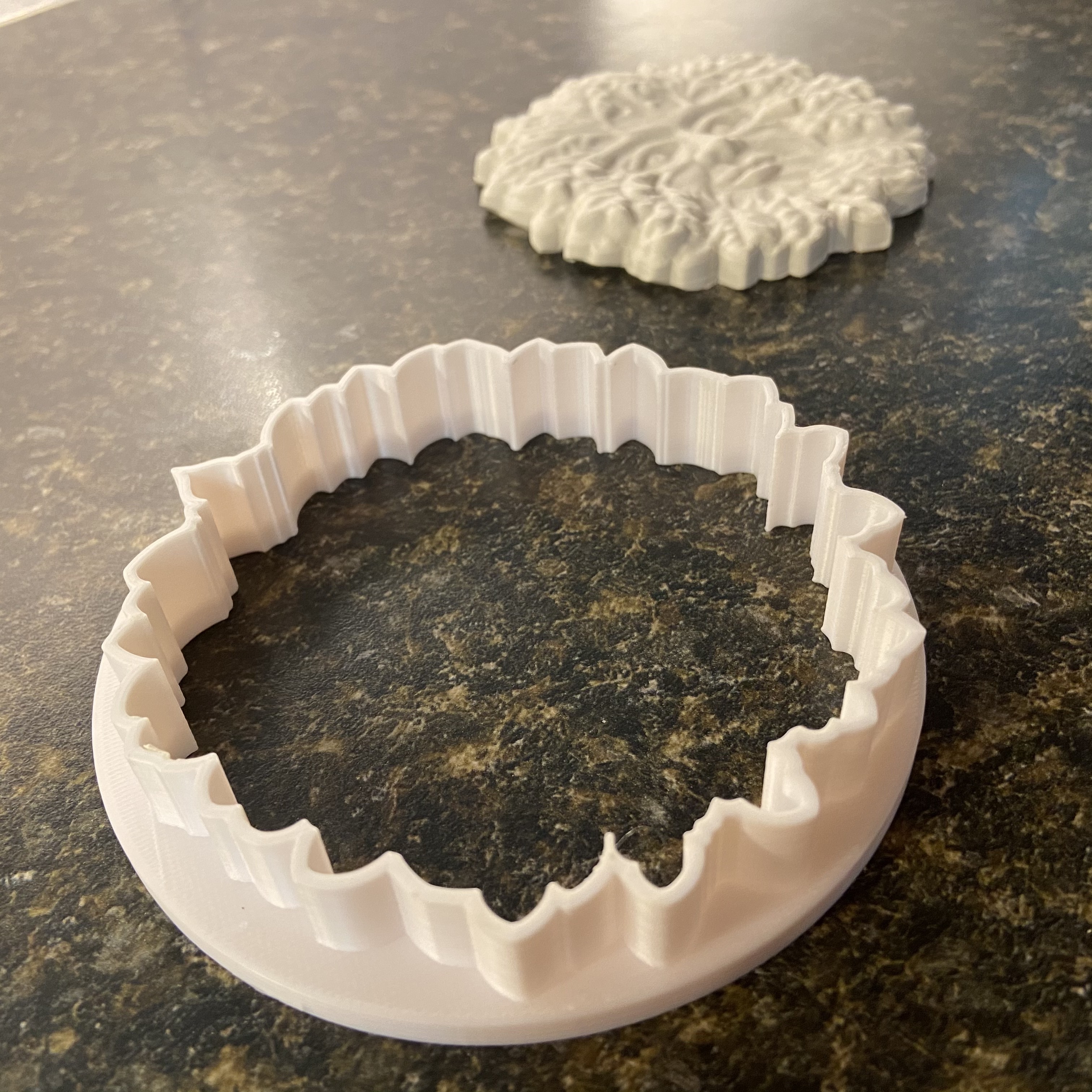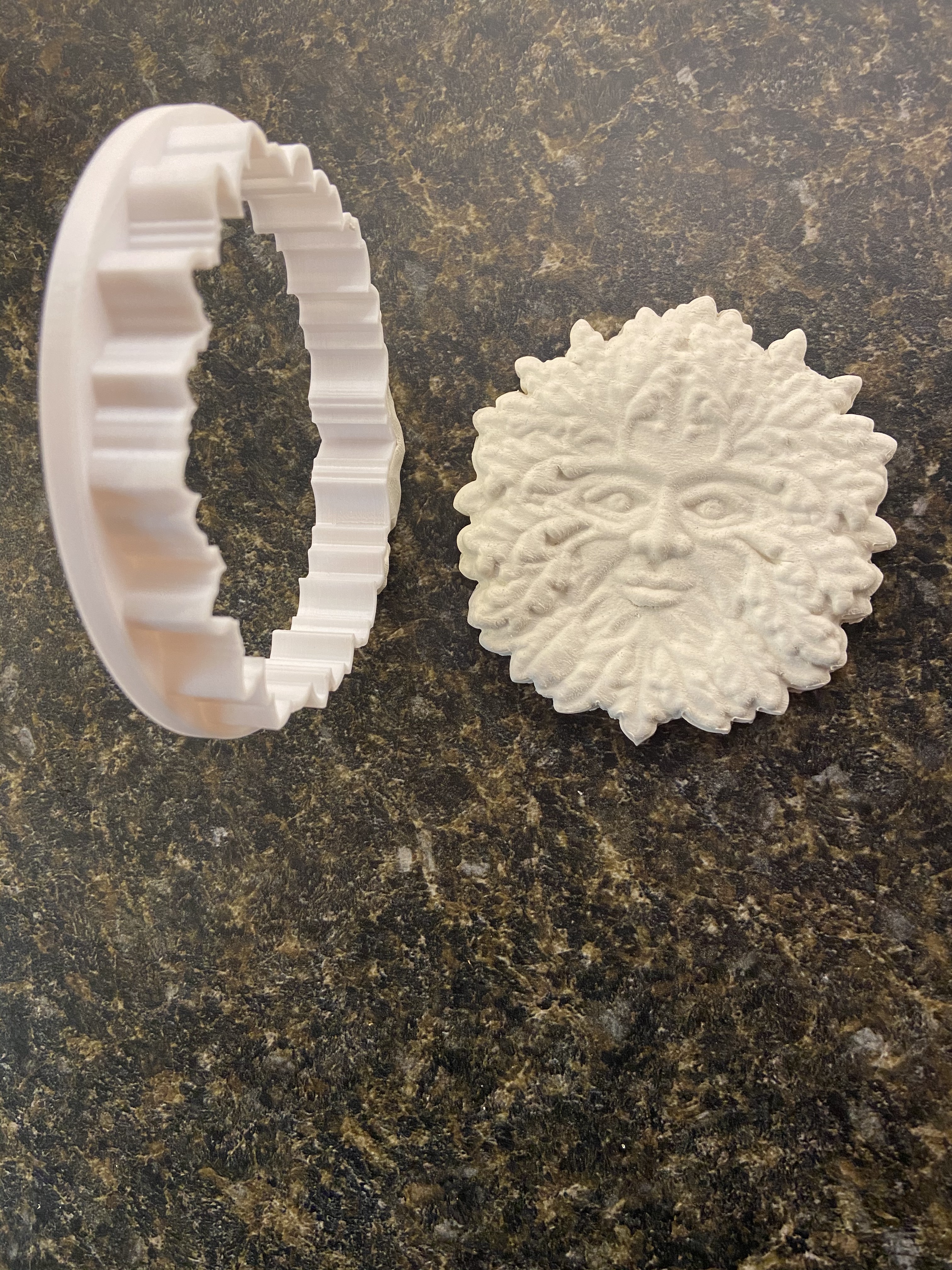 GREEN MAN COOKIE CUTTER (Cookie Cutter only) is made by S.R. White Carving & Son for our Green Man Springerle Cookie Mold. Our Cookie Cutters are 3D printed in white with a food safe PLA. Made in the USA. The inside dimensions at the largest points of this cutter measure apprx. 3 3/4” in diameter x 1/2″ deep. The Cookie Cutters can be used with any dough or clay. (Pictures of molded imprints are made with sculpey clay.)