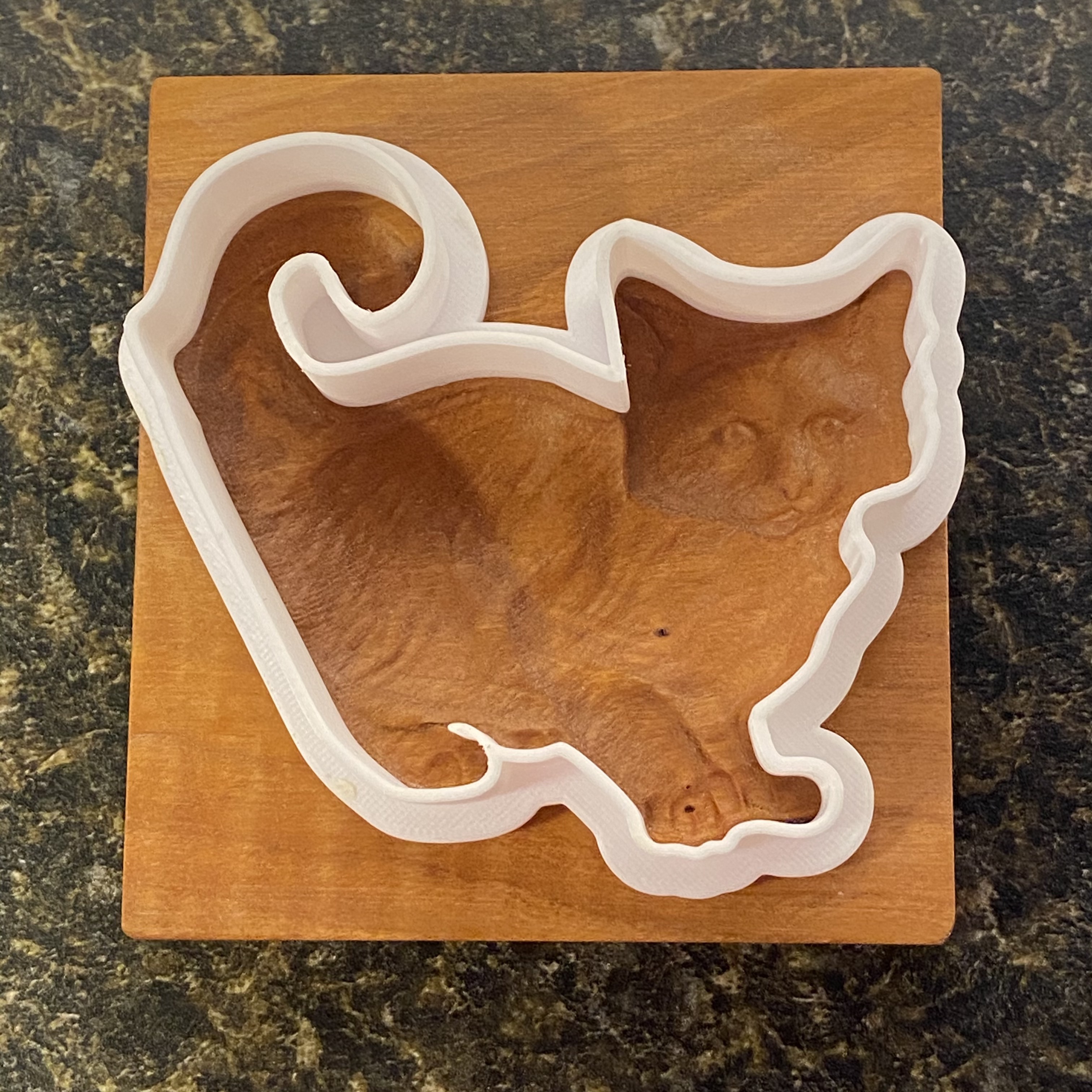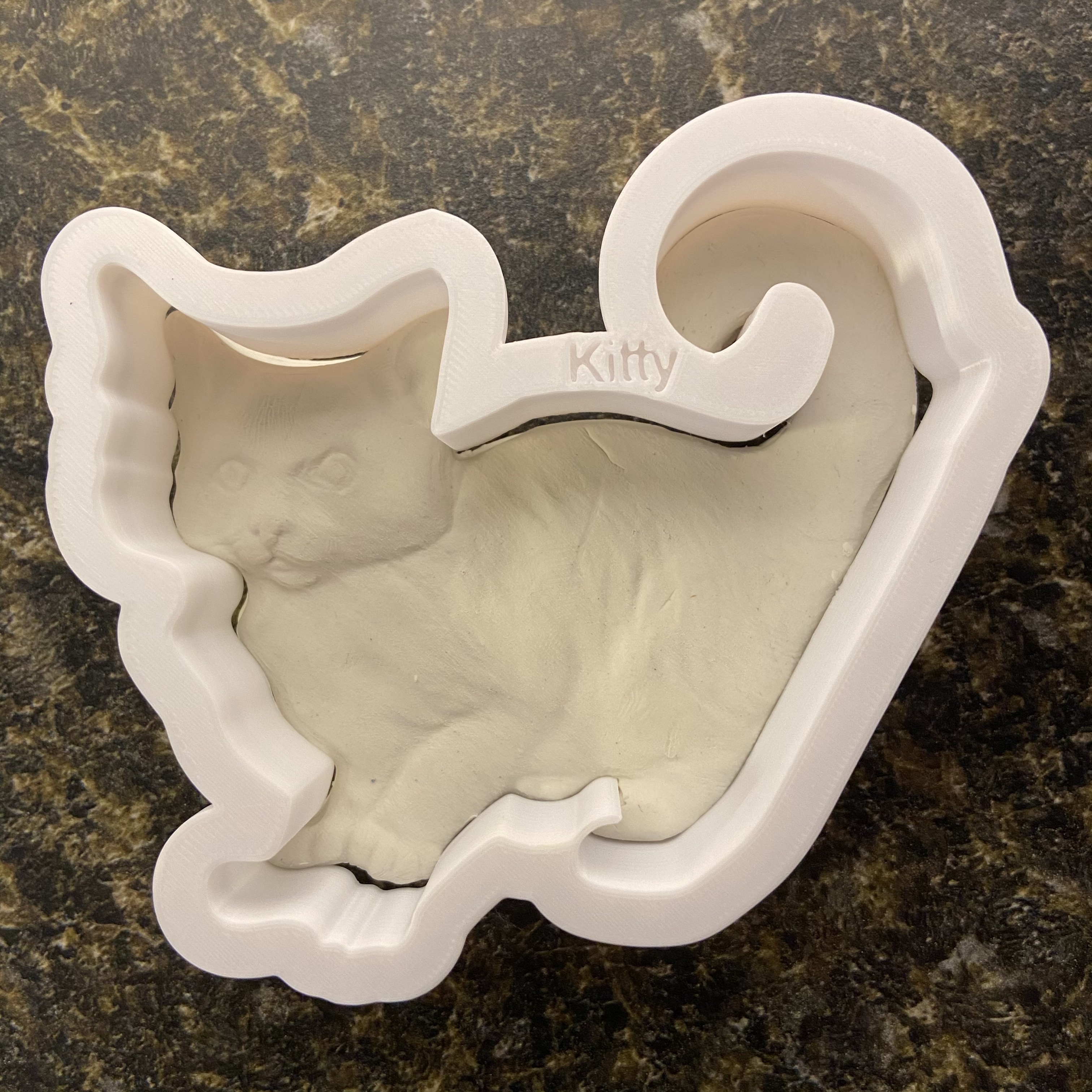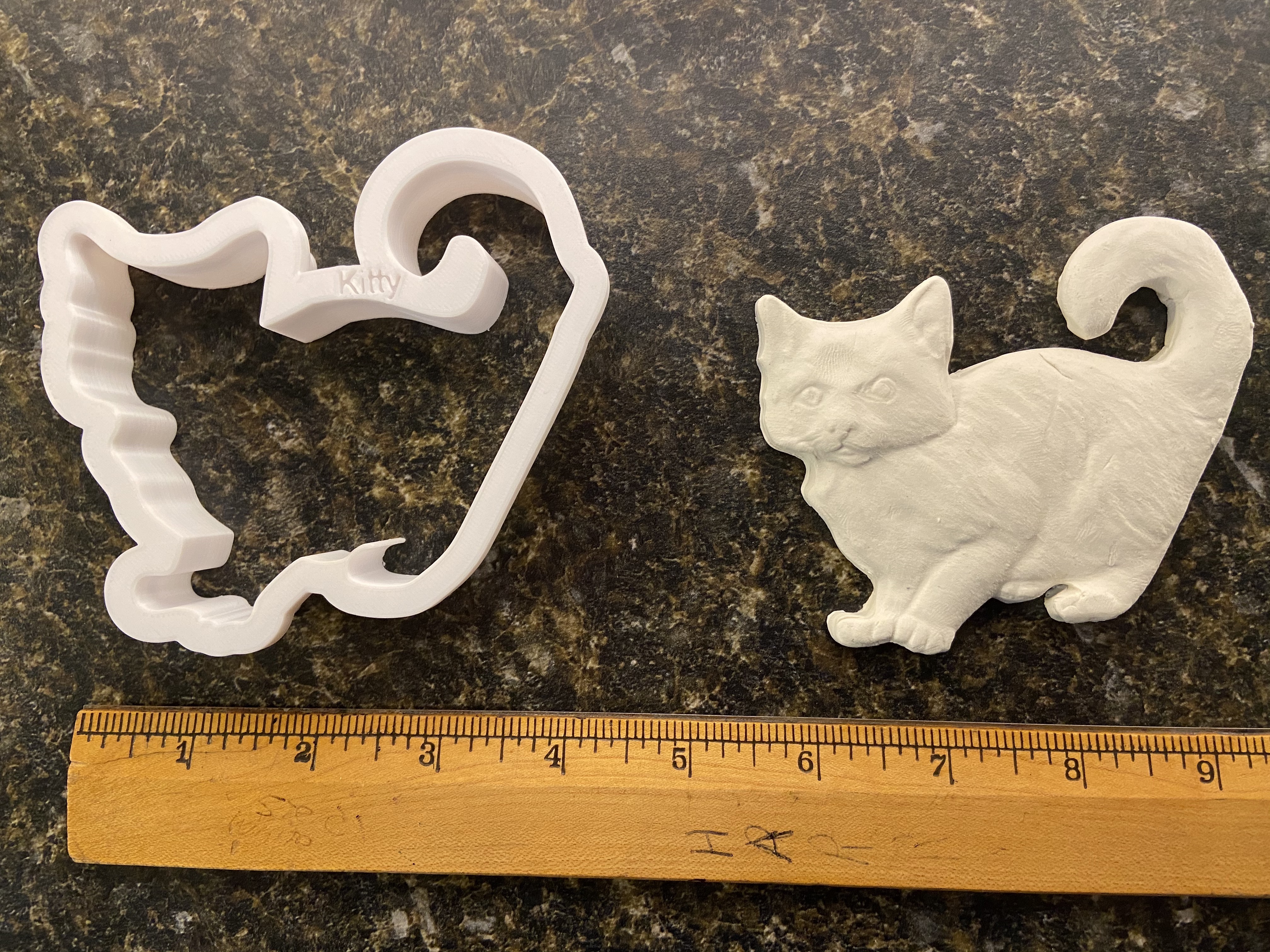 KITTY COOKIE CUTTER (Cookie Cutter only) is made by S.R. White Carving & Son for our Kitty Springerle Cookie Mold. Our Cookie Cutters are 3D printed in white with a food safe PLA. Made in the USA. The inside dimensions at the largest points of this cutter measure apprx. 3 3/4” high x 3 1/2” wide x 1/2″ deep. The Cookie Cutters can be used with any dough or clay. (Pictures of molded imprints are made with sculpey clay.)