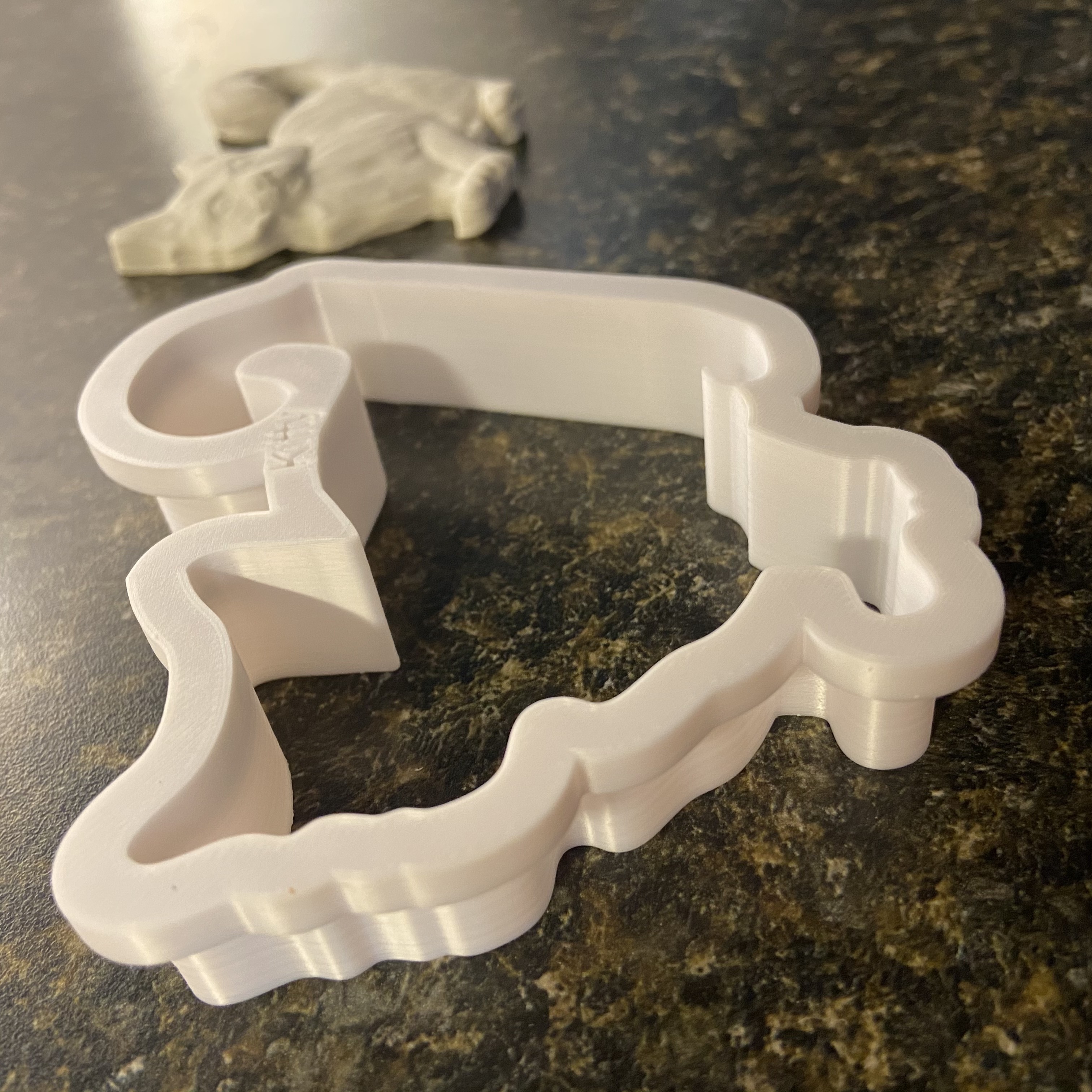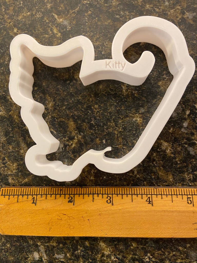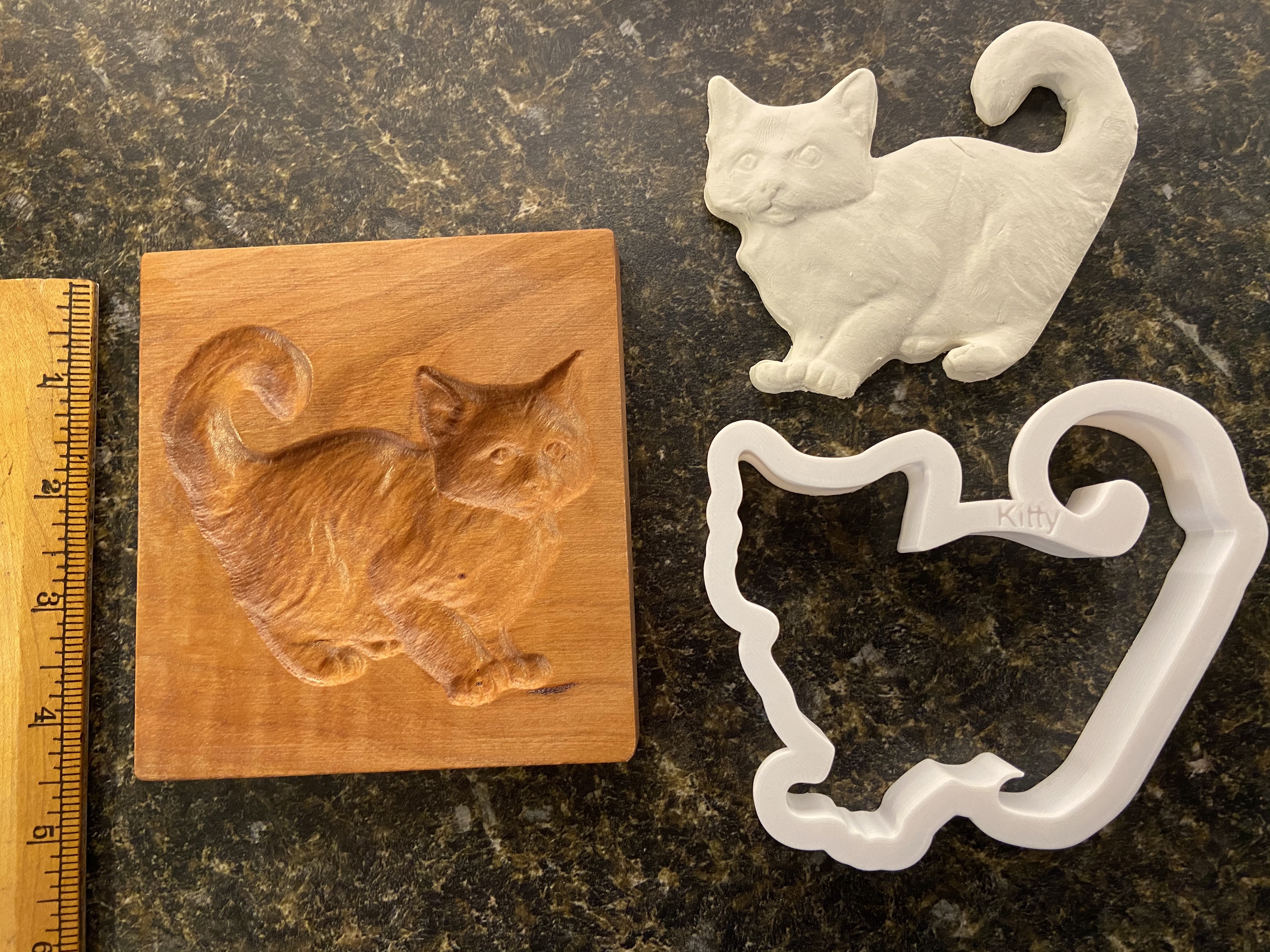 KITTY COOKIE CUTTER (Cookie Cutter only) is made by S.R. White Carving & Son for our Kitty Springerle Cookie Mold. Our Cookie Cutters are 3D printed in white with a food safe PLA. Made in the USA. The inside dimensions at the largest points of this cutter measure apprx. 3 3/4” high x 3 1/2” wide x 1/2″ deep. The Cookie Cutters can be used with any dough or clay. (Pictures of molded imprints are made with sculpey clay.)