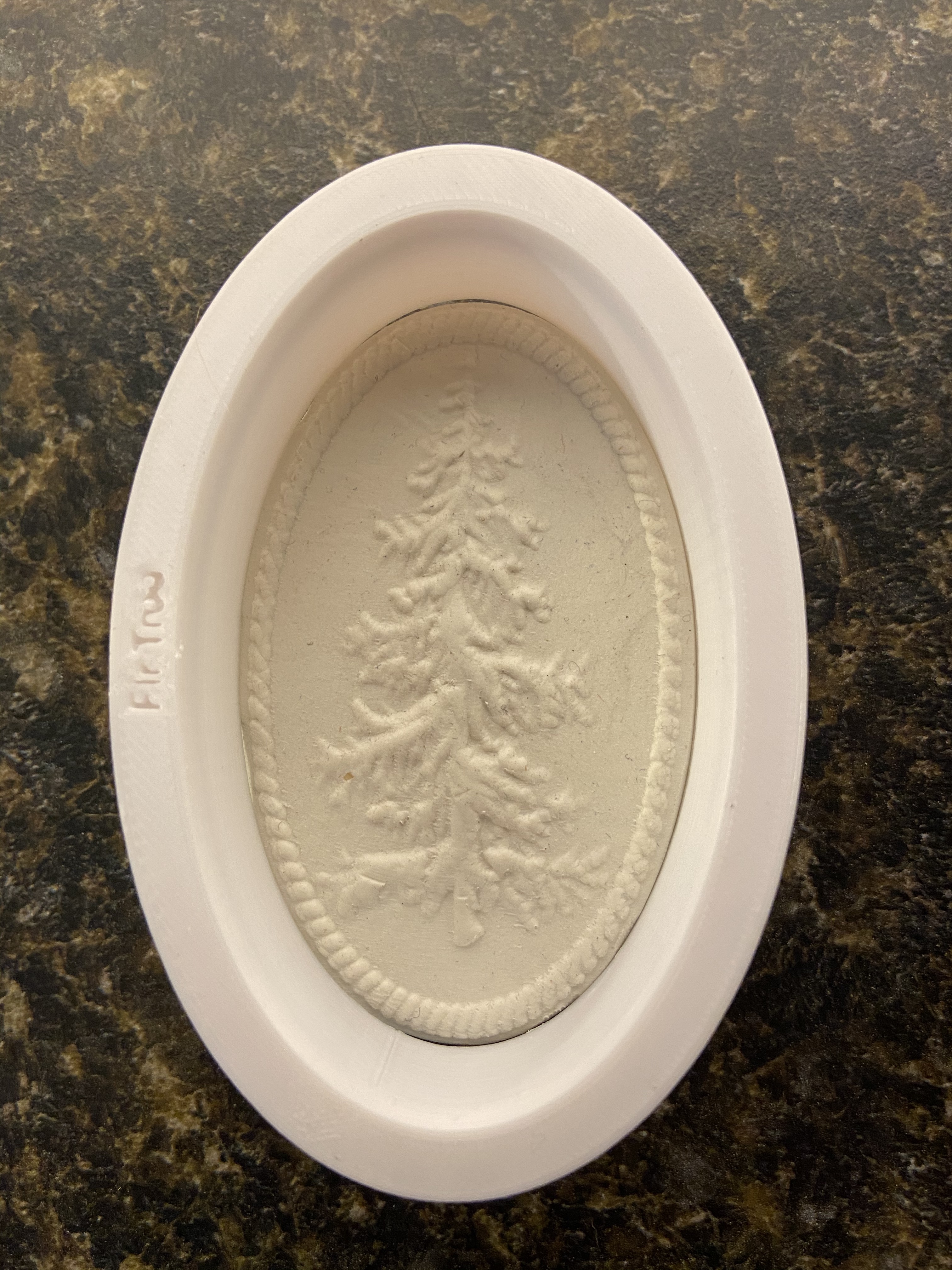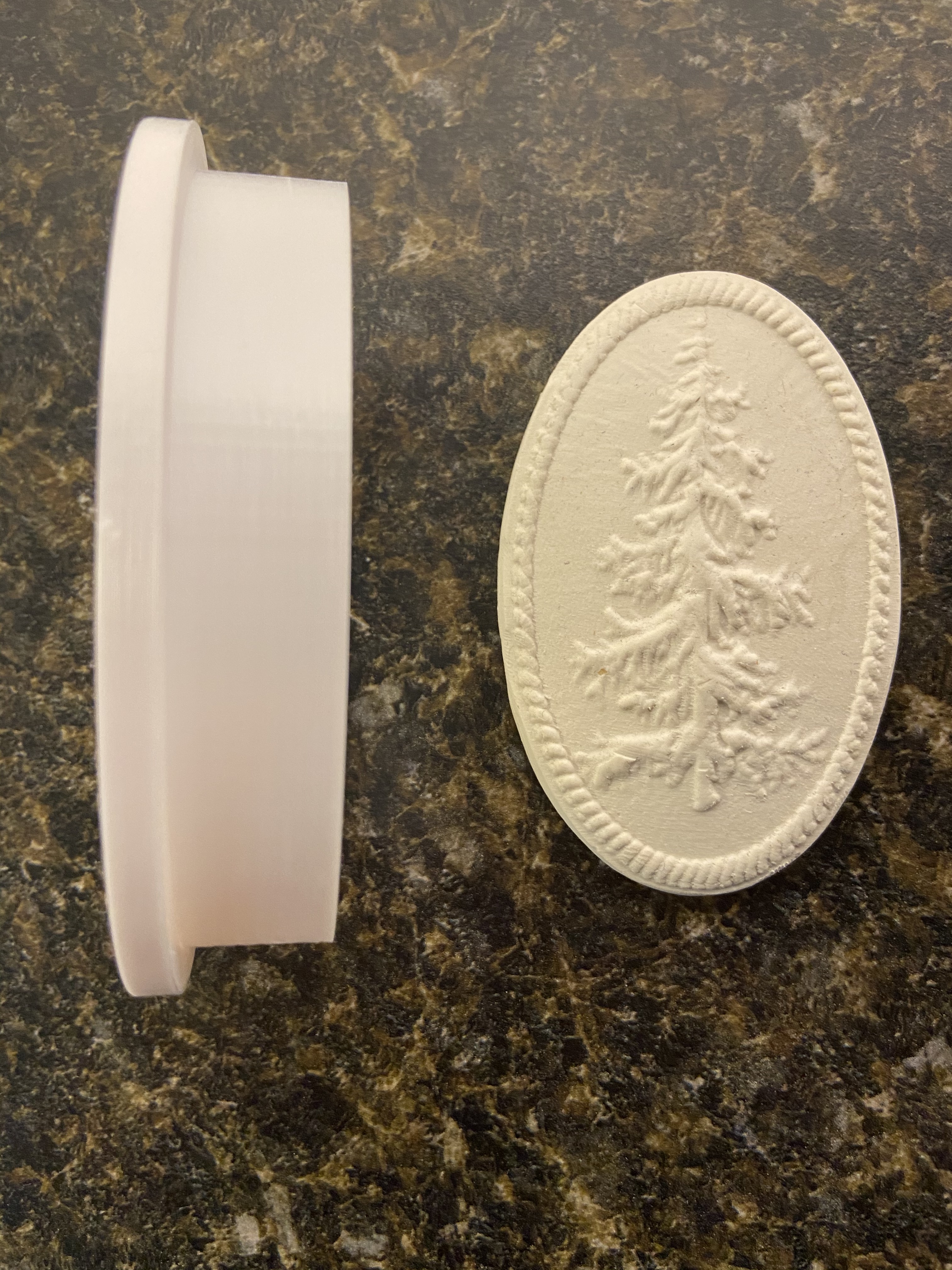OVAL 3 1/4″ COOKIE CUTTER (Cookie Cutter only) is made by S.R. White Carving & Son for the Fir Tree Springerle Cookie Mold. Our Cookie Cutters are 3D printed in white with a food safe PLA. Made in the USA. The inside dimensions at the largest points of this cutter measure apprx. 3 1/4” x 2” oval and 1/2″ deep. The Cookie Cutters can be used with any dough or clay. (Pictures of molded imprints are made with sculpey clay.)