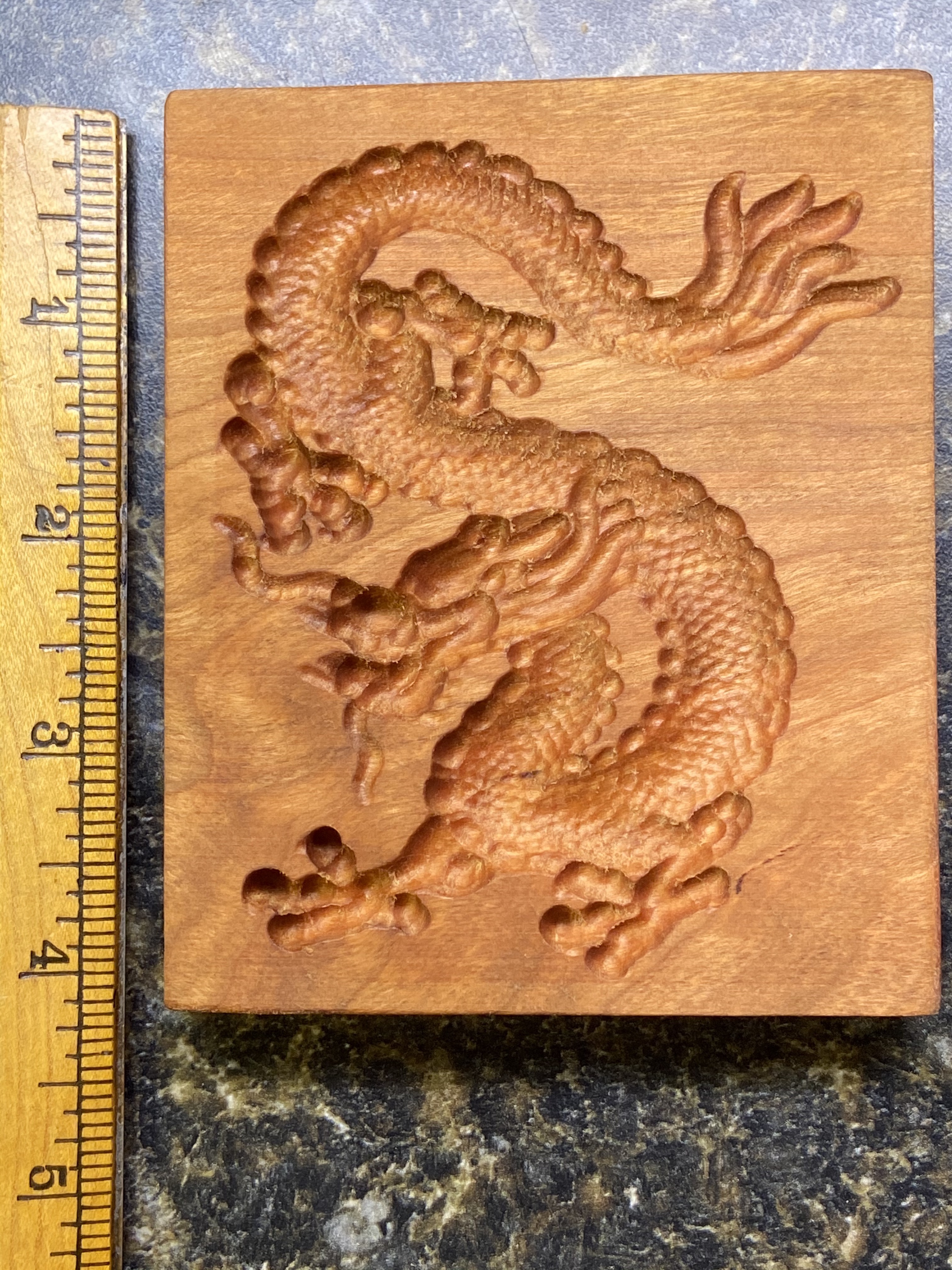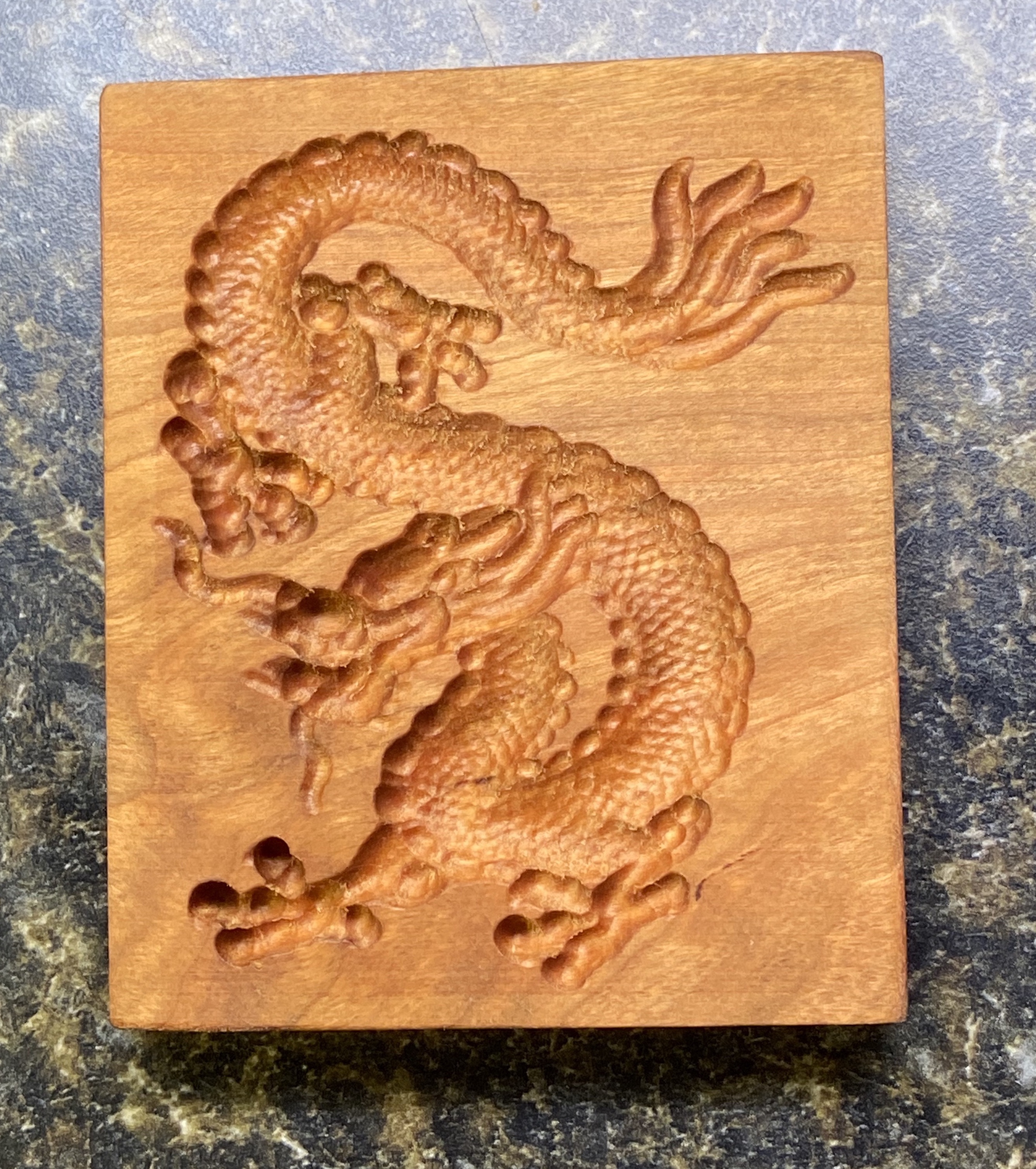 CHINESE DRAGON SPRINGERLE COOKIE MOLD (Wooden Cookie Mold only) measuring approximately 4″ high x 3 1/2” wide x 1/2” thick; sizes will vary slightly. Each Springerle Mold is carved from kiln dried American Cherry wood and given a food-safe mineral oil finish. Carved by S.R. White Carving & Son in our Pennsylvania workshop. Each pattern is intricately carved in reverse to create a positive image in cookie dough or other pliable materials for craft projects. These Springerle Cookie Molds will make beautiful decorative cookies that you can use to adorn your Holiday table. Crafters can also use these Cookie Molds to make festive decorations because of their decorative design. A Springerle Cookie recipe is included with each Cookie Mold. Collect all our Springerle Cookie Molds for your baking and Holiday decorating. (Pictures of molded Chinese Dragon are made with sculpey clay.)