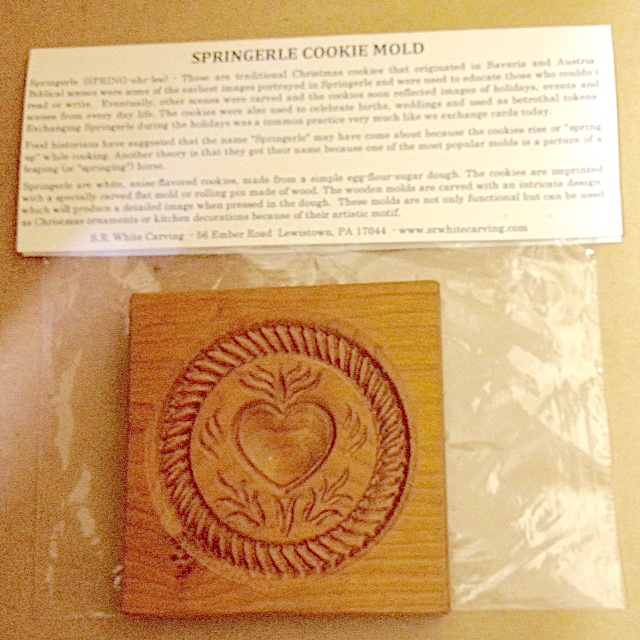 HEART SPRINGERLE COOKIE MOLD (Wooden Cookie Mold only) measuring approximately 3 1/2″ square x 1/2” thick; sizes will vary slightly. Each Springerle Mold is carved from kiln dried American Cherry wood and given a food-safe mineral oil finish. Carved by S.R. White Carving & Son in our Pennsylvania workshop. Each pattern is intricately carved in reverse to create a positive image in cookie dough or other pliable materials for craft projects. These Springerle Cookie Molds will make beautiful decorative cookies that you can use to adorn your Holiday table. Crafters can also use these Cookie Molds to make festive decorations because of their decorative design. A Springerle Cookie recipe is included with each Cookie Mold. Collect all our Springerle Cookie Molds for your baking and Holiday decorating. (Pictures of molded Heart are made with sculpey clay.)