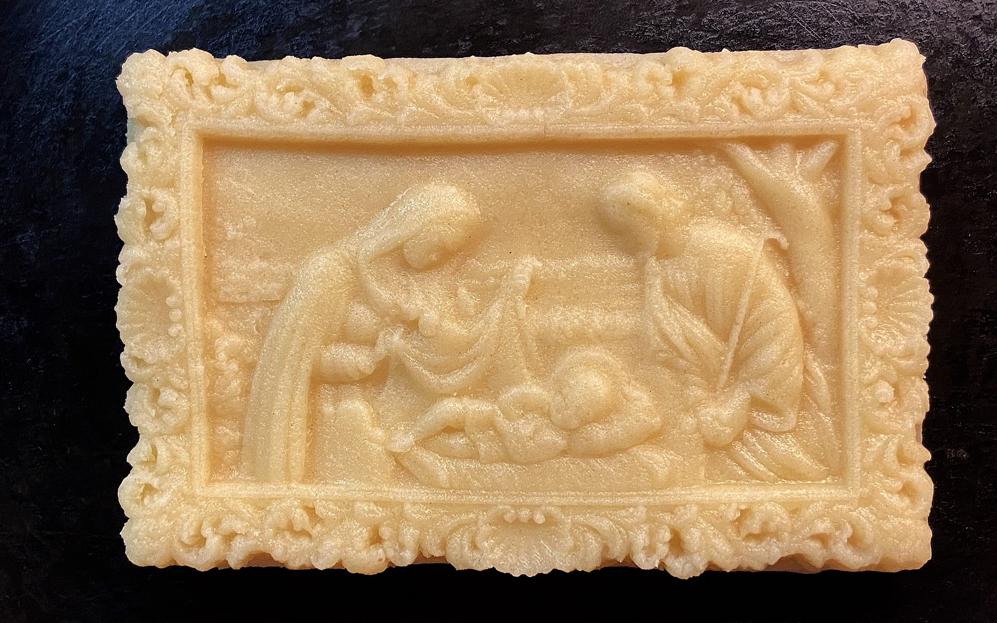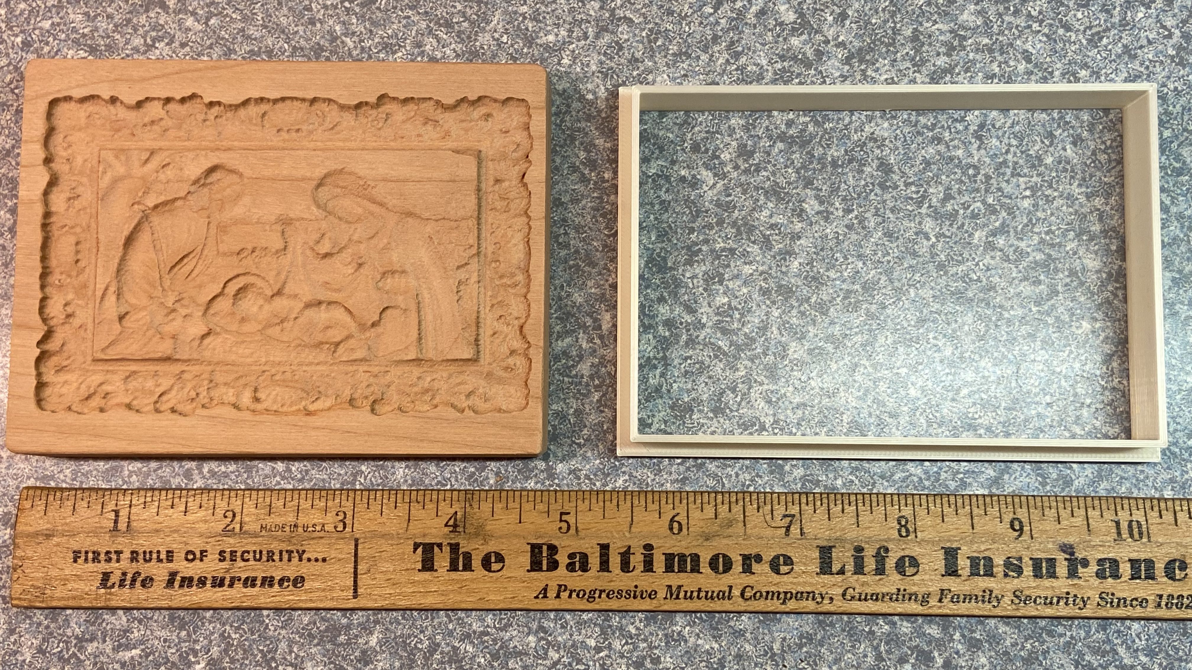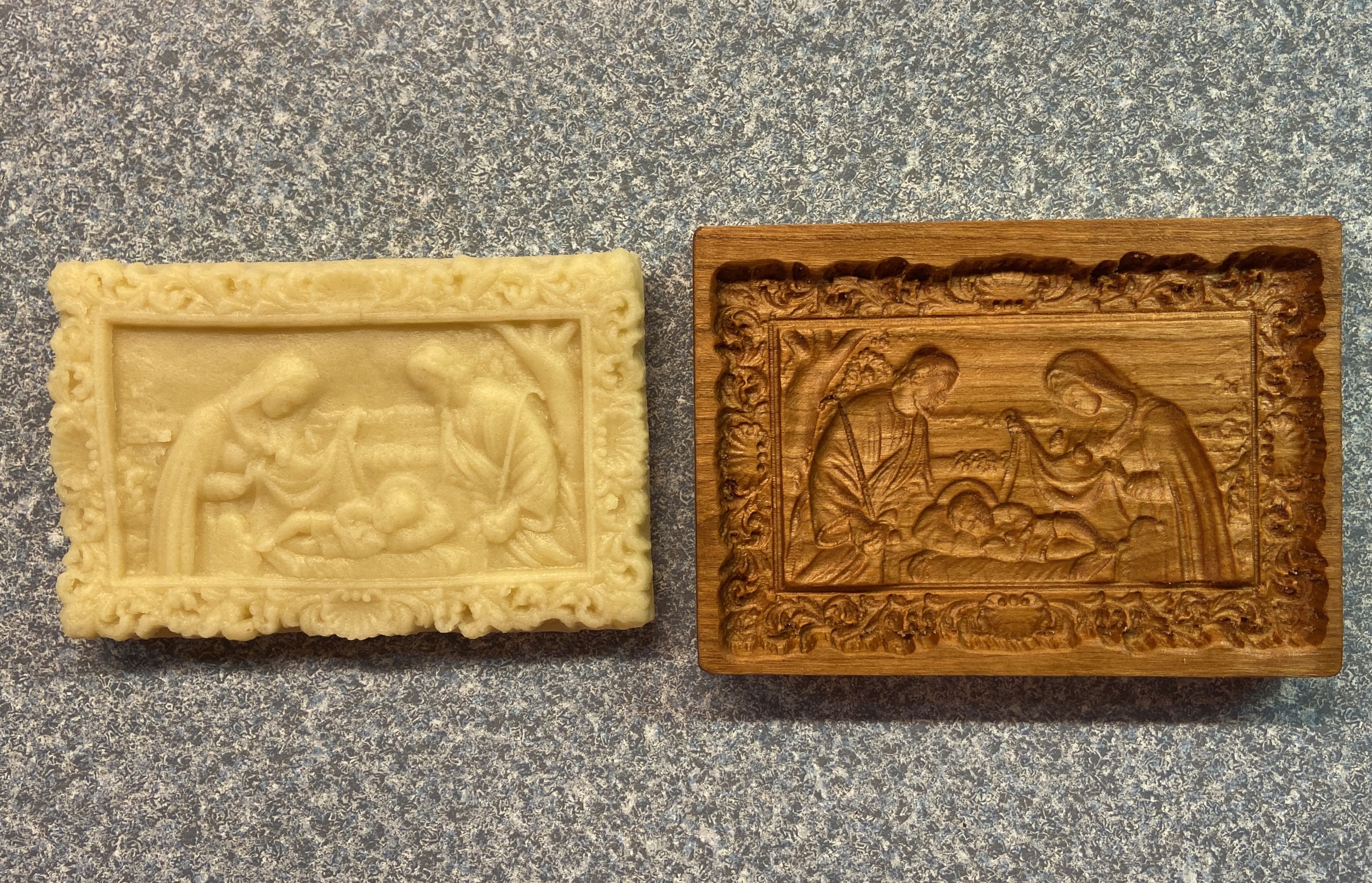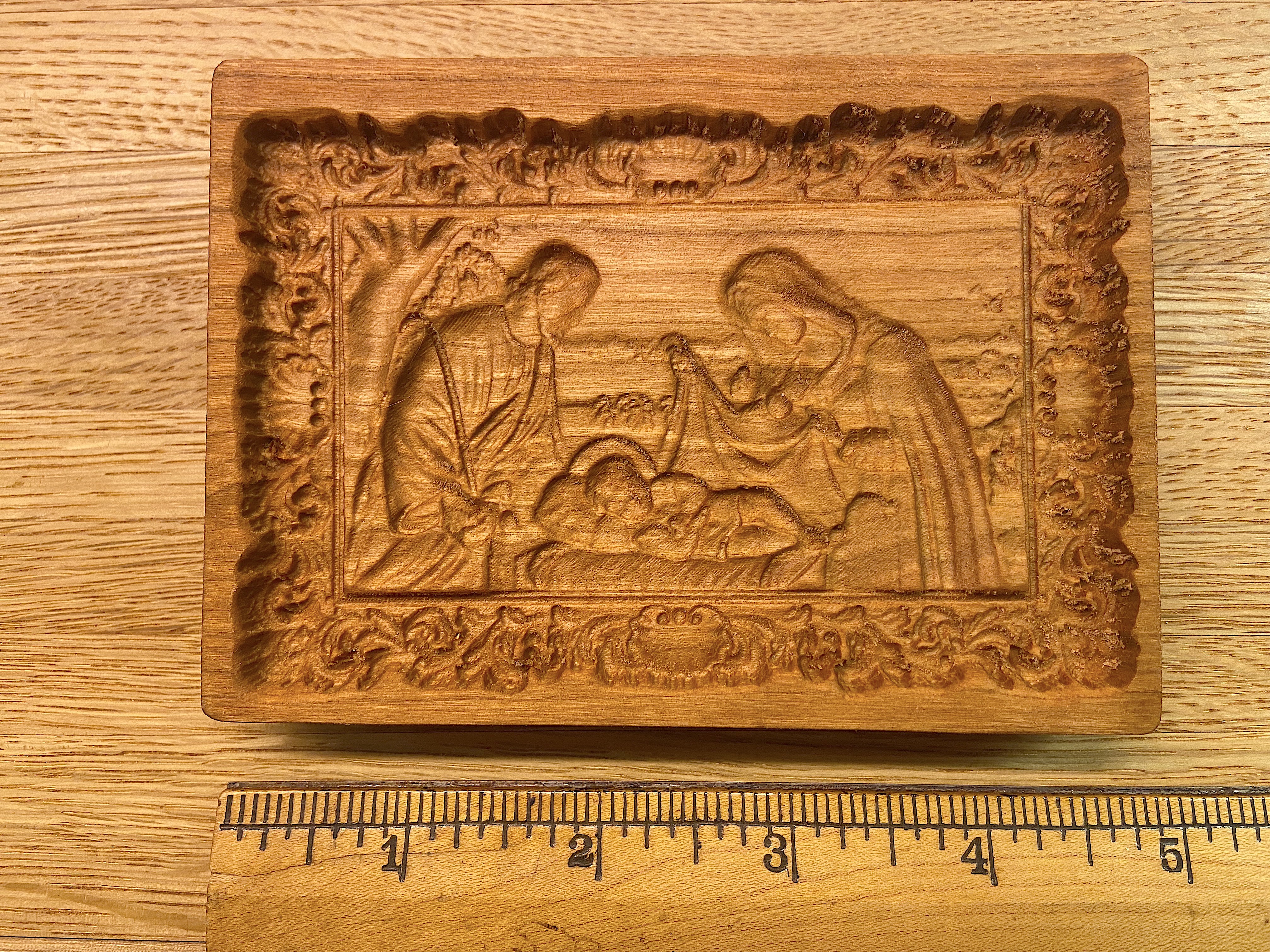 NATIVITY IN FRAME SPRINGERLE COOKIE MOLD (Wooden Cookie Mold only) measuring approximately 4 5/8″ long x 3 1/4” high x 1/2” thick; sizes will vary slightly. Each Springerle Mold is carved from kiln dried American Cherry wood and given a food-safe mineral oil finish. Carved by S.R. White Carving & Son in our Pennsylvania workshop. Each pattern is intricately carved in reverse to create a positive image in cookie dough or other pliable materials for craft projects. These Springerle Cookie Molds will make beautiful decorative cookies that you can use to adorn your Holiday table. Crafters can also use these Cookie Molds to make festive decorations because of their decorative design. A Springerle Cookie recipe is included with each Cookie Mold. Collect all our Springerle Cookie Molds for your baking and Holiday decorating. (Pictures of molded Nativity in Frame are made with dough.)