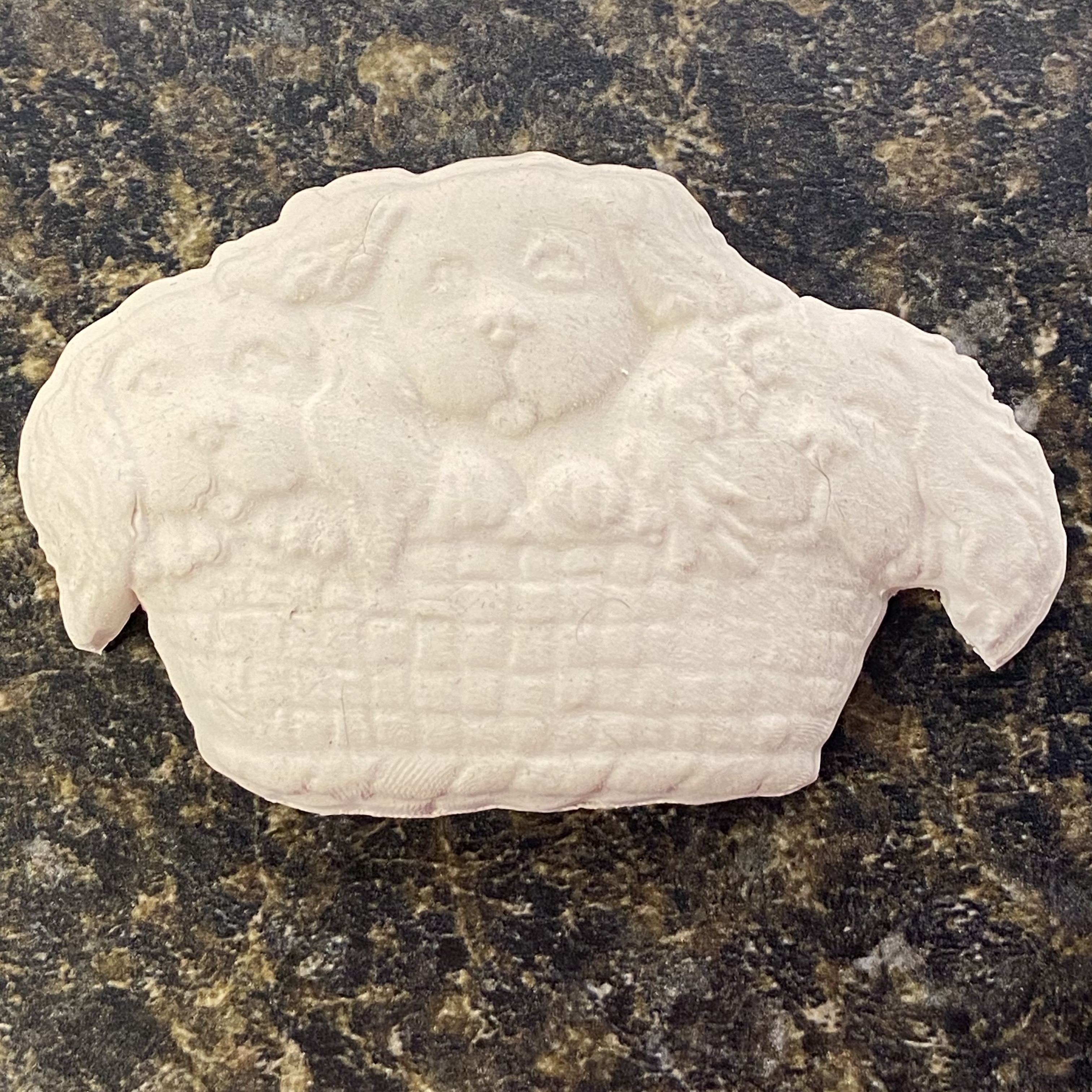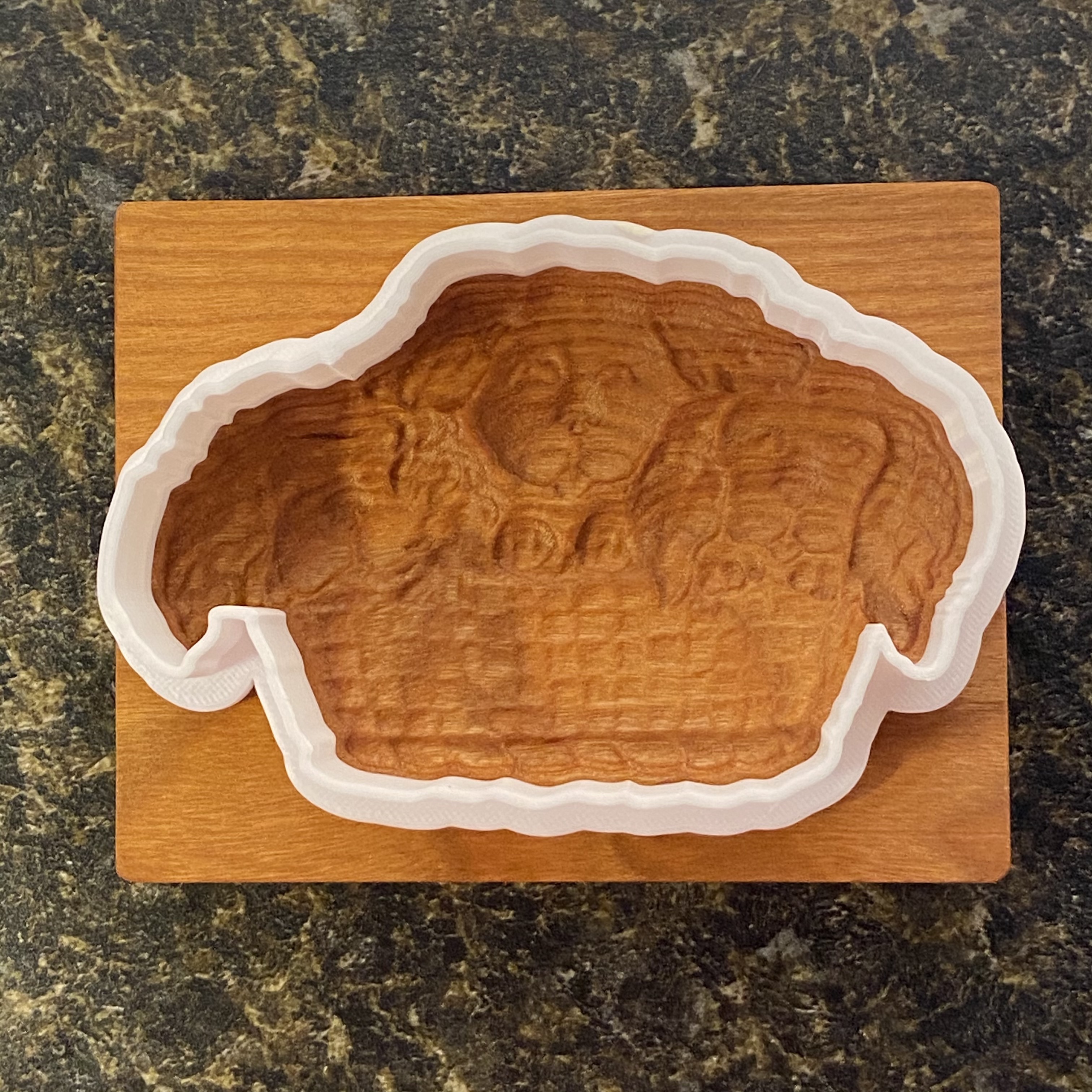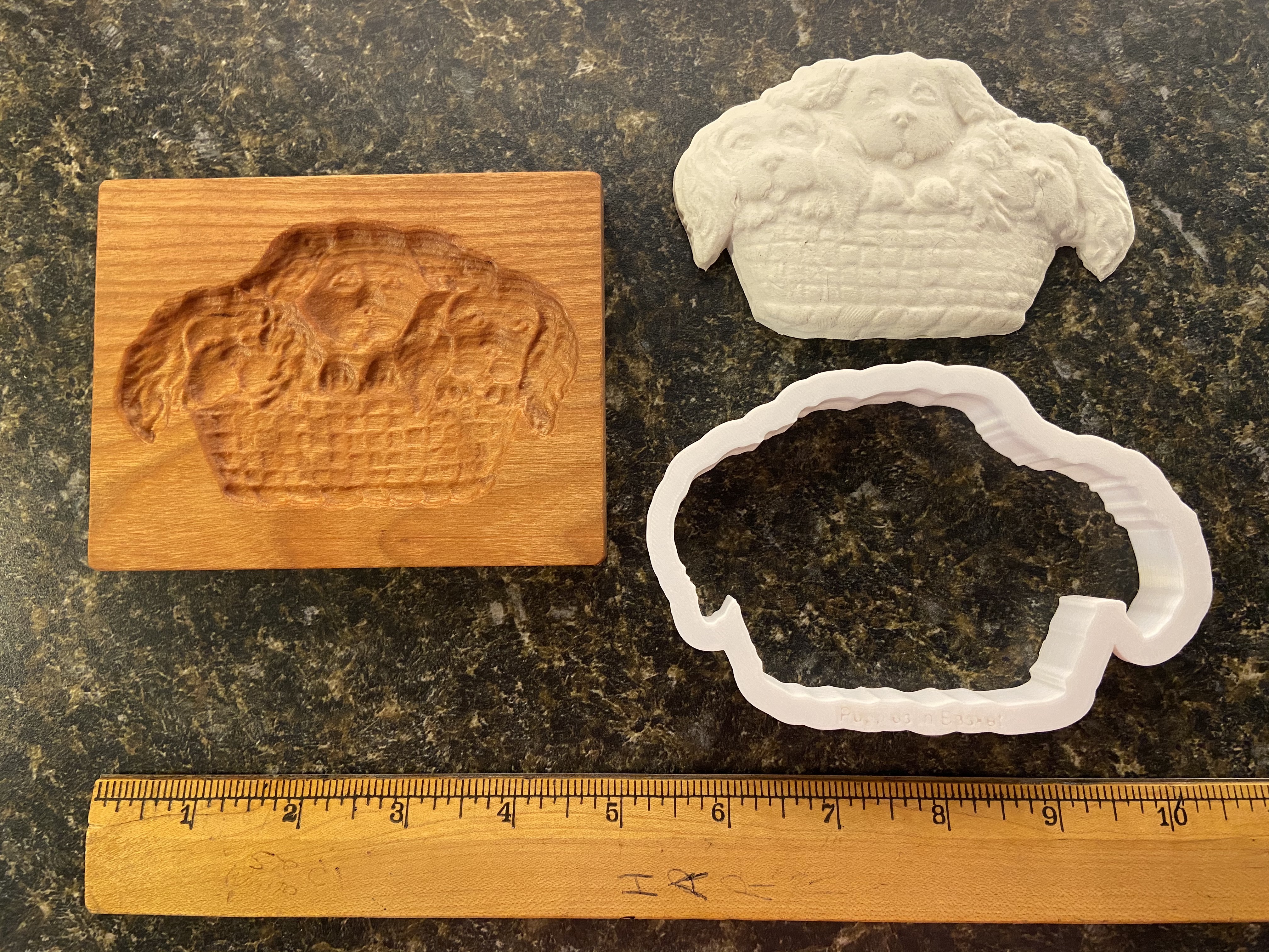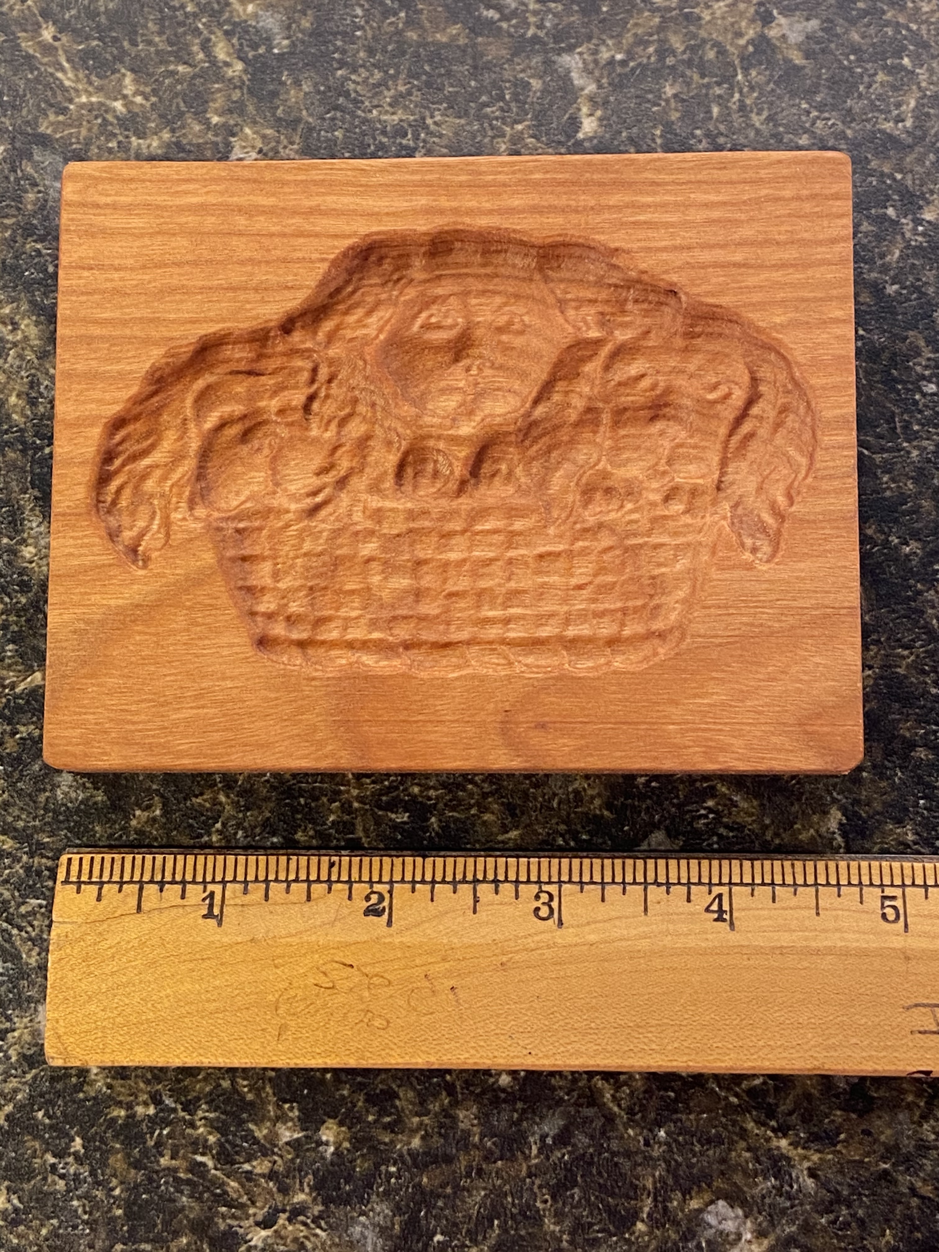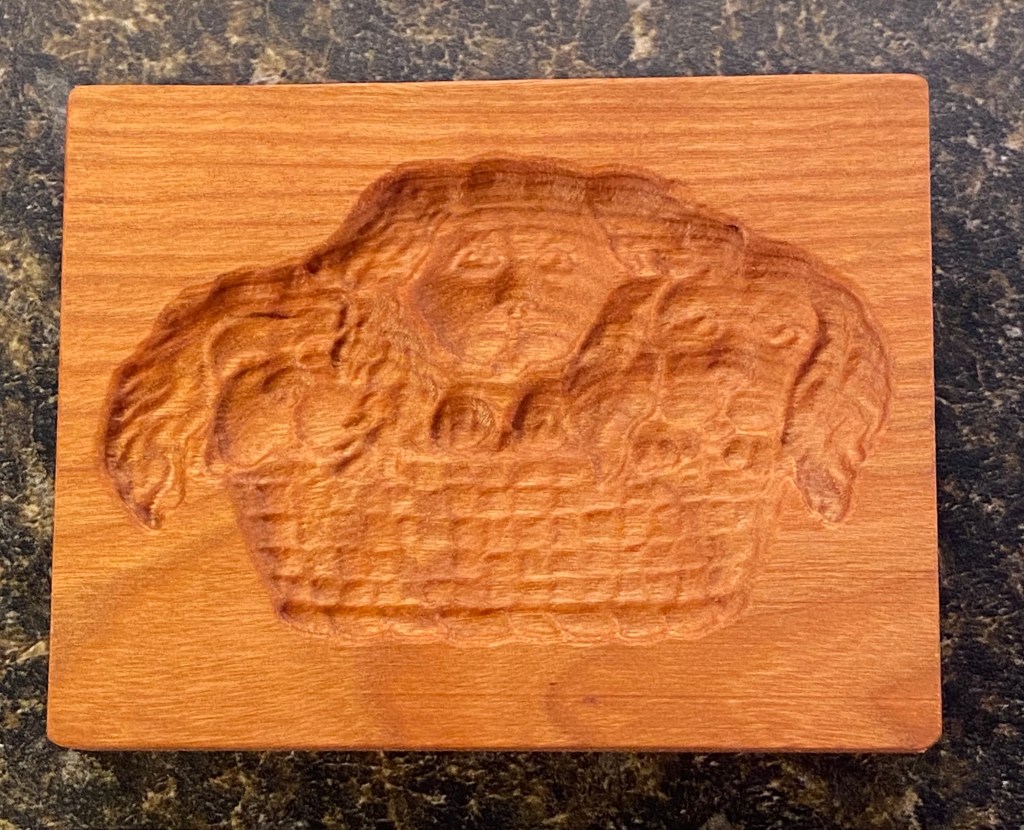 PUPPIES IN BASKET SPRINGERLE COOKIE MOLD (Wooden Cookie Mold only) measuring approximately 3 3/4″ high x 4 3/4” wide x 1/2” thick; sizes will vary slightly. Each Springerle Mold is carved from kiln dried American Cherry wood and given a food-safe mineral oil finish. Carved by S.R. White Carving & Son in our Pennsylvania workshop. Each pattern is intricately carved in reverse to create a positive image in cookie dough or other pliable materials for craft projects. These Springerle Cookie Molds will make beautiful decorative cookies that you can use to adorn your Holiday table. Crafters can also use these Cookie Molds to make festive decorations because of their decorative design. A Springerle Cookie recipe is included with each Cookie Mold. Collect all our Springerle Cookie Molds for your baking and Holiday decorating. (Pictures of molded Puppies in Basket are made with sculpey clay.)