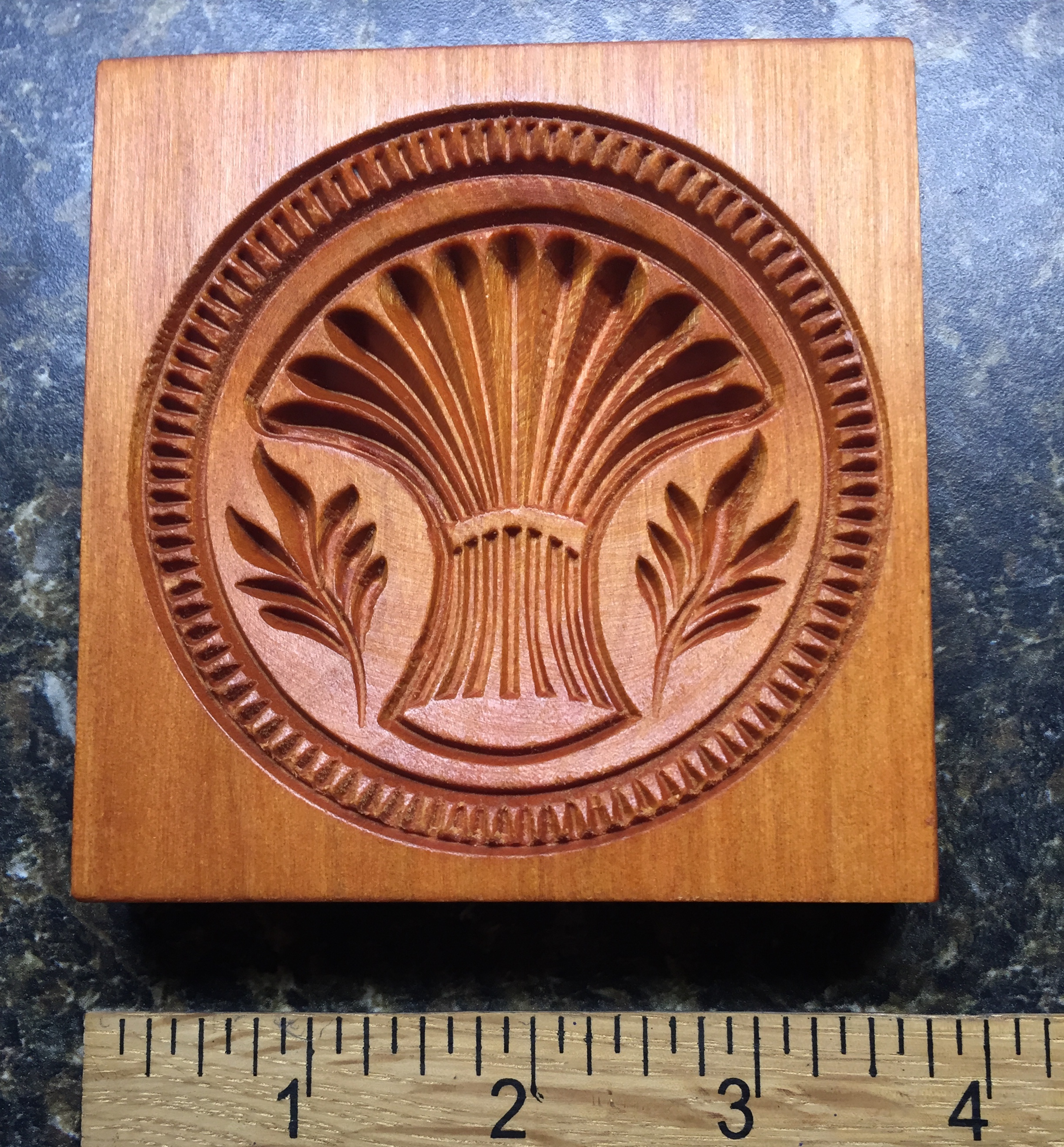SHEAF OF WHEAT SPRINGERLE COOKIE MOLD (Wooden Cookie Mold only) measuring approximately 4″ square x 1/2” thick; sizes will vary slightly. Each Springerle Mold is carved from kiln dried American Cherry wood and given a food-safe mineral oil finish. Carved by S.R. White Carving & Son in our Pennsylvania workshop. Each pattern is intricately carved in reverse to create a positive image in cookie dough or other pliable materials for craft projects. These Springerle Cookie Molds will make beautiful decorative cookies that you can use to adorn your Holiday table. Crafters can also use these Cookie Molds to make festive decorations because of their decorative design. A Springerle Cookie recipe is included with each Cookie Mold. Collect all our Springerle Cookie Molds for your baking and Holiday decorating. (Pictures of molded Wheat are made with sculpey clay.)
