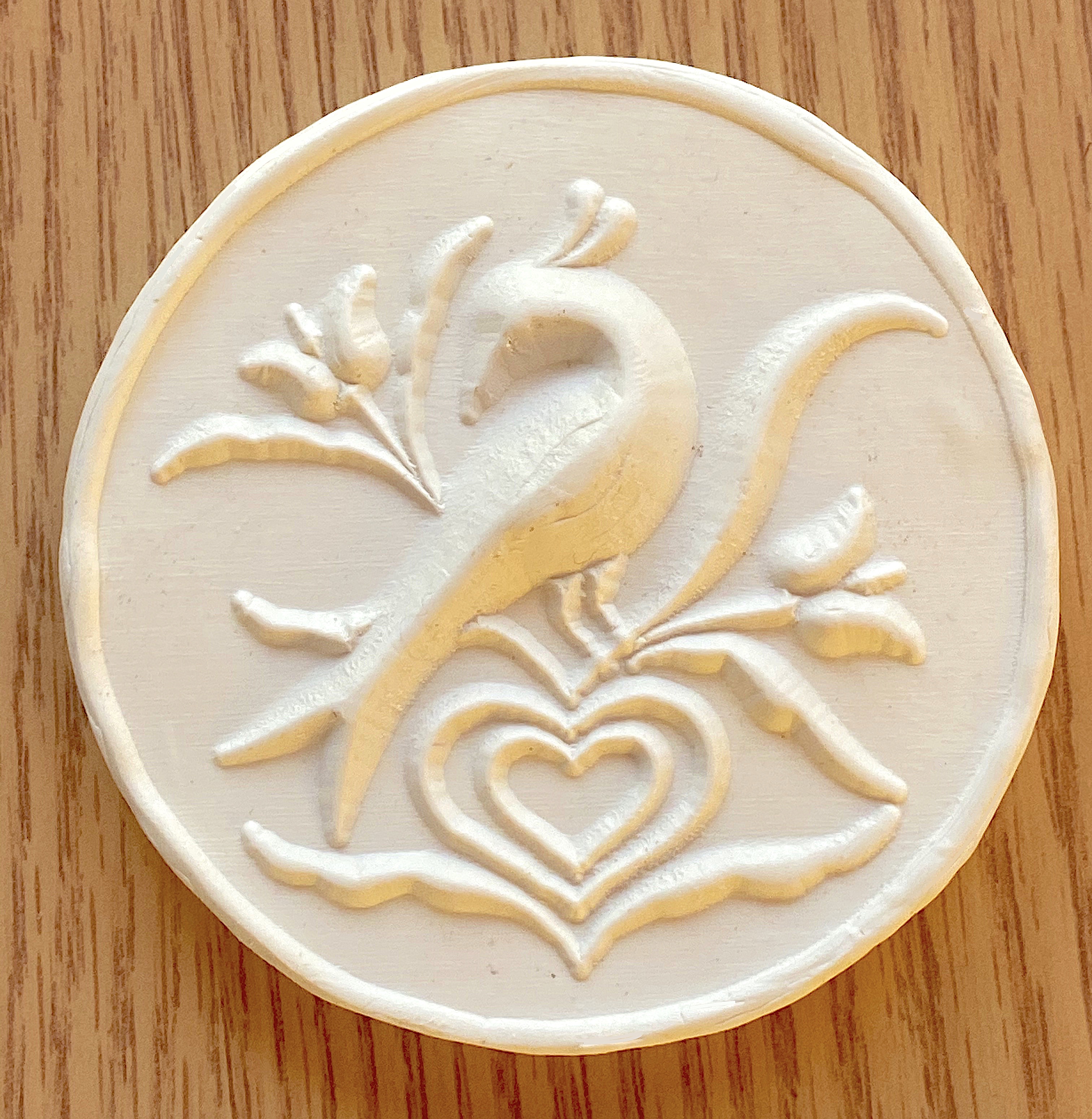 SINGLE DISTELFINK SPRINGERLE COOKIE MOLD (Wooden Cookie Mold only) measuring approximately 3 1/2″ square x 1/2” thick; sizes will vary slightly. Each Springerle Mold is carved from kiln dried American Cherry wood and given a food-safe mineral oil finish. Carved by S.R. White Carving & Son in our Pennsylvania workshop. Each pattern is intricately carved in reverse to create a positive image in cookie dough or other pliable materials for craft projects. These Springerle Cookie Molds will make beautiful decorative cookies that you can use to adorn your Holiday table. Crafters can also use these Cookie Molds to make festive decorations because of their decorative design. A Springerle Cookie recipe is included with each Cookie Mold. Collect all our Springerle Cookie Molds for your baking and Holiday decorating. (Pictures of molded Single Distelfink are made with sculpey clay.)