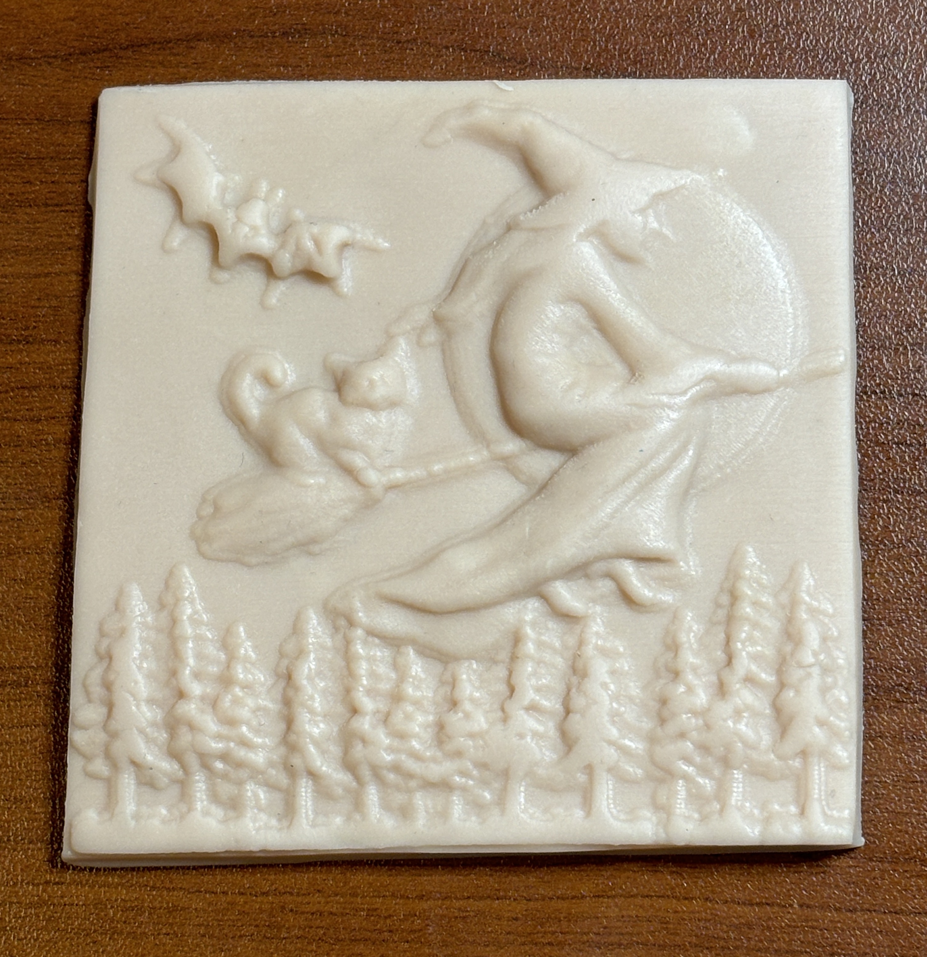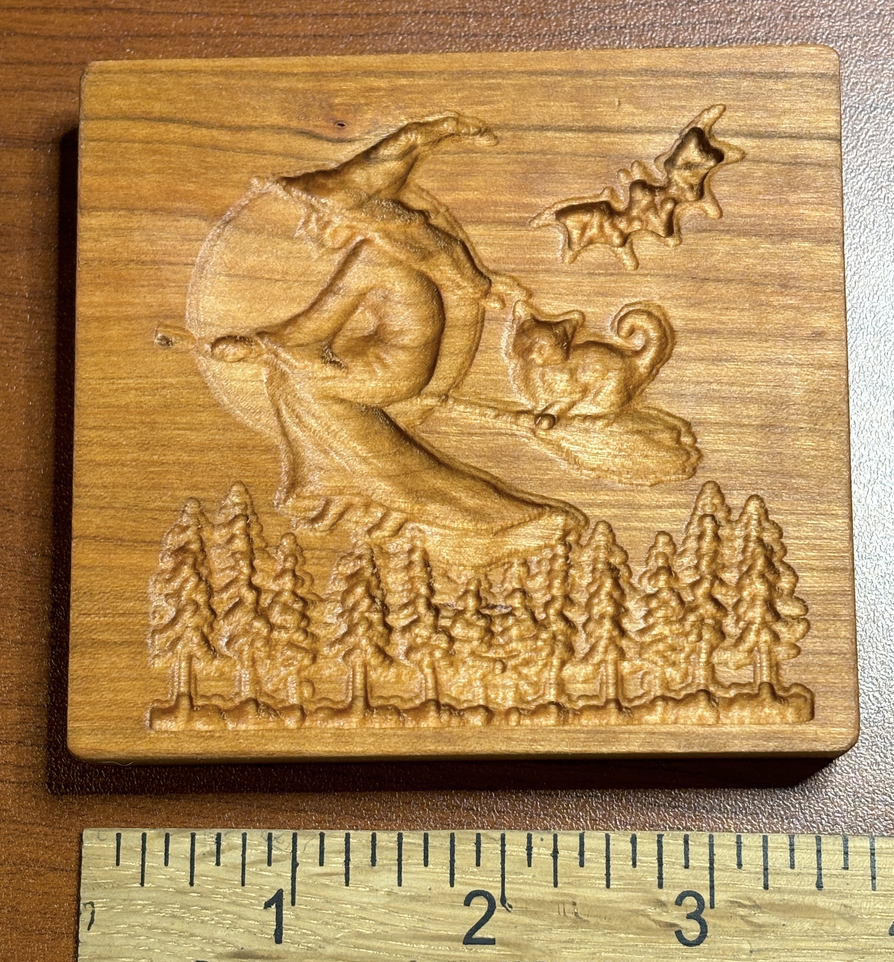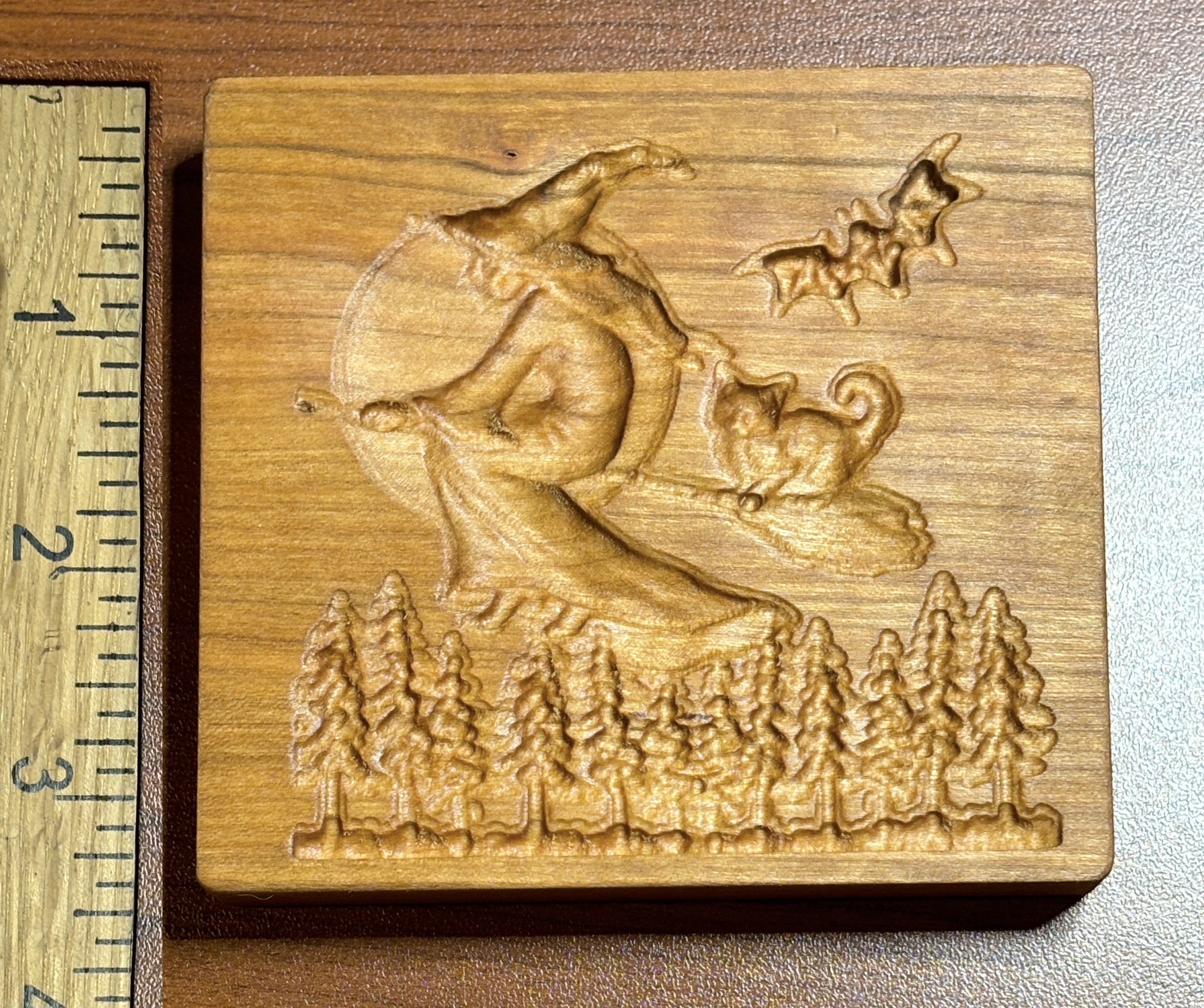 WITCH FLYING SPRINGERLE COOKIE MOLD (Wooden Cookie Mold only) measuring approximately 3 3/4″ square 1/2” thick; sizes will vary slightly. Each Springerle Mold is carved from kiln dried American Cherry wood and given a food-safe mineral oil finish. Carved by S.R. White Carving & Son in our Pennsylvania workshop. Each pattern is intricately carved in reverse to create a positive image in cookie dough or other pliable materials for craft projects. These Springerle Cookie Molds will make beautiful decorative cookies that you can use to adorn your Holiday table. Crafters can also use these Cookie Molds to make festive decorations because of their decorative design. A Springerle Cookie recipe is included with each Cookie Mold. Collect all our Springerle Cookie Molds for your baking and Holiday decorating. (Pictures of molded Witch Flying are made with sculpey clay.)
