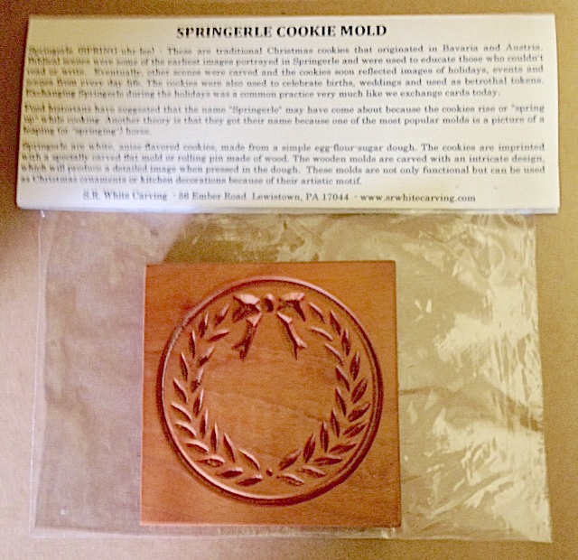 WREATH SPRINGERLE COOKIE MOLD (Wooden Cookie Mold only) measuring approximately 3 1/2″ square x 1/2” thick; sizes will vary slightly. Each Springerle Mold is carved from kiln dried American Cherry wood and given a food-safe mineral oil finish. Carved by S.R. White Carving & Son in our Pennsylvania workshop. Each pattern is intricately carved in reverse to create a positive image in cookie dough or other pliable materials for craft projects. These Springerle Cookie Molds will make beautiful decorative cookies that you can use to adorn your Holiday table. Crafters can also use these Cookie Molds to make festive decorations because of their decorative design. A Springerle Cookie recipe is included with each Cookie Mold. Collect all our Springerle Cookie Molds for your baking and Holiday decorating. (Pictures of molded Wreath are made with sculpey clay.)